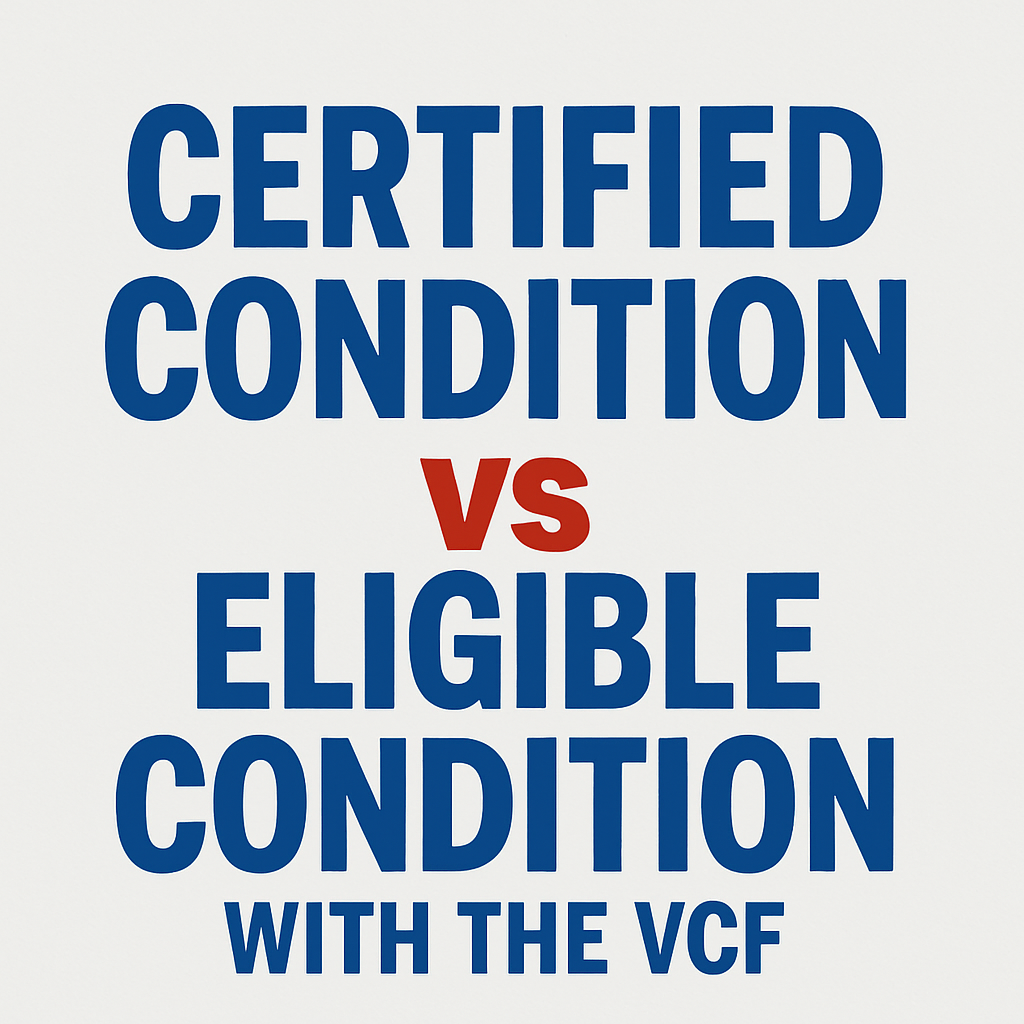 An eligible condition refers to a medical condition that the VCF recognizes for financial compensation.